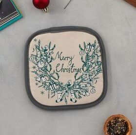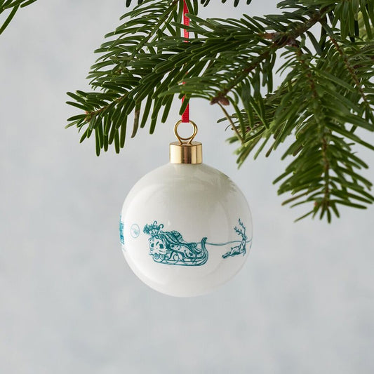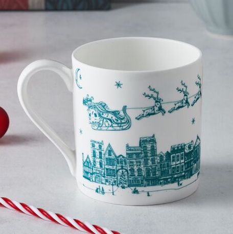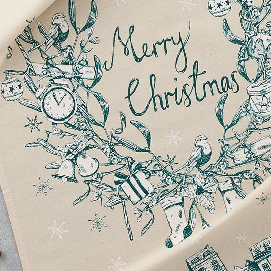 The beautifully hand illustrated Night Before Christmas collection highlights a magical and nostalgic view of Christmas. The traditional festive legend sees reindeer pulling a Father Christmas in a sleigh through the night sky to deliver gifts to children on Christmas Eve. As they fly silently over a snowy picturesque English town people below go about their last minute preparations unaware of the magic happening above them. In the centre of the design a wreath is filled with snowflakes, fairy lights, mistletoe, robins and stockings serving as a reminder of everything you love about this enchanting time of year.
