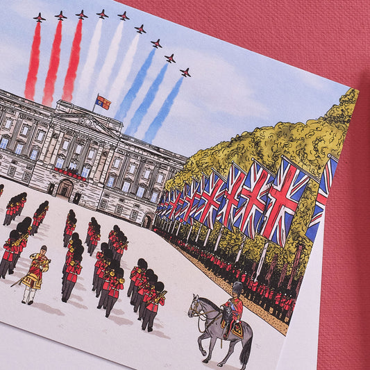 Celebrate the splendour and joy of British pageantry with the Trooping the Colour Collection. Bursting with vibrant colour and playful detail, this collection brings The Mall to life – Union Jack flags waving, the Red Arrows soaring overhead, and the King’s Guard marching in perfect time as the Royal Family looks on from Buckingham Palace.